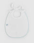 Babero de bebé con doble capa confeccionado en 100% algodón pima, y con reverso en rizo de toalla para ayudar a que los líquidos no traspasen. En color blanco con detalle de crochet hecho a mano en color Azul.