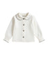 Blusa blanca en bambula suave con cuello redondo y detalles gris oscuro