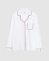 En en color blanco con vivo burgundy , bolsillo en la parte superior izquierda de la camisa y pantalón con cintura elástica y lazo. El puño lleva una luna Petite Siesta® bordada a mano.