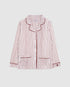 En blanc avec rayures bordeaux et passepoil bordeaux, poches au bas de la chemise et pantalon avec ceinture élastique et nœud. La poche présente une lune Petite Siesta brodée à la main.