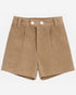 Bermuda de pana suave en color beige confeccionada a mano en algodón de alta calidad, con cinturilla elástica en la parte trasera para mayor comodidad y botones delanteros de nácar. Tiene bolsillos laterales y pinzas frontales que aportan una caída impecable.