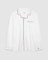 In white with burgundy trim Pocket on the top left side of the shirt and pants with an elastic waistband and bow. The pocket features a hand-embroidered Petite Siesta® moon.